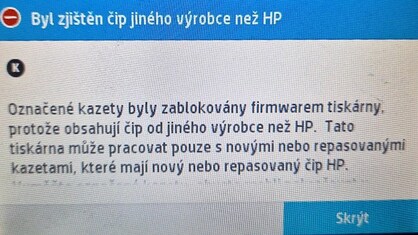 Výrobci tiskáren mohou automaticky aktualizovat firmware vaší tiskárny bez vašeho vědomí, zejména pokud je připojena k vaší Wi-Fi nebo prostřednictvím kabelu přímo připojeného k vašemu počítači s připojením k internetu. Pokud tato aktualizace proběhne, můžete zaznamenat na displeji tiskárny či na monitoru tuto zprávu: Označené kazety byly zablokovány firmwarem tiskárny, protože obsahují čip od jiného výrobce než HP.